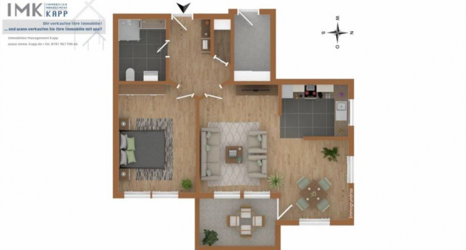 Der Grundrissplan zeigt eine durchdachte 2-Zimmer-Wohnung mit moderner Raumaufteilung und einer großzügigen Terrasse, die perfekt in das Wohnkonzept integriert ist. Hier eine angepasste Beschreibung für ein Exposé: